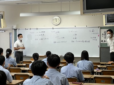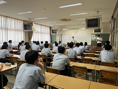 初めに、学年主任から、日程の説明がありました。アクティビティや宿泊先などを聞いて、生徒は楽しそうに聞いていました。