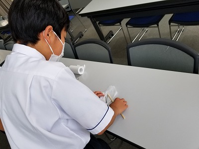 割りばしとトイレットペーパーを使って掃除道具を作っていました。