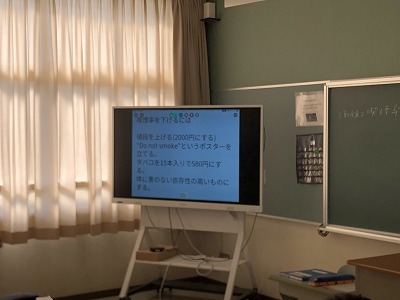 4年生の保健では、「たばこと健康」を学習します。前回の授業でたばこの煙に含まれている有害物質や、タバコを吸っていない周りの人が煙を吸ってしまう受動喫煙などを学び、今回の授業では喫煙率を下げるための国や社会の取り組みとして、どんなことができるかを班になって考えて発表してもらいました。どの班もそれぞれの意見を出し合い、よく話し合いがされていい発表をしていました。
