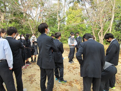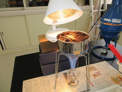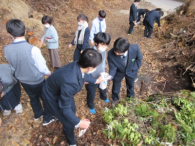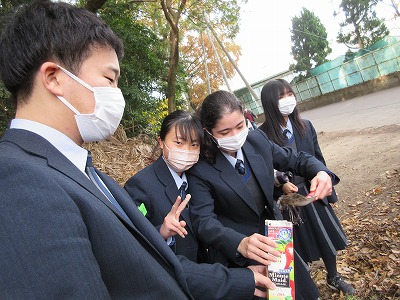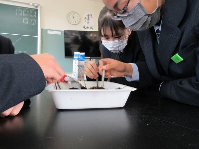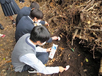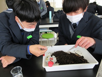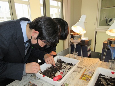 生物基礎の学習で学校近くの神社へ行き、土壌生物の採集を行いました。照葉樹林の代表的な植物や森林の階層構造を観察したあと、枯葉を積んであるところで土壌を採集しました。学校に帰って土壌をバットに広げ、ピンセットで目に見える大きい生物を採集。目に見えない小さい土壌生物は、ツルグレン装置で集めます。ツルグレン装置とは、電球を使って熱や光、乾燥を嫌う土壌動物を土から追い出して集める装置で、100均の粉ふるいとじょうごで作成しました。