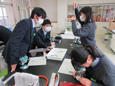 次の授業では、採集した生物を双眼実体顕微鏡で観察して生物の種類を分類し、基準に従って点数化を行い、調査地点の環境の評価を行いました。タブレットで顕微鏡写真も撮りました。結果は3クラス15班の平均が27点で30点未満なので「人間によって荒らされた環境」となりました。