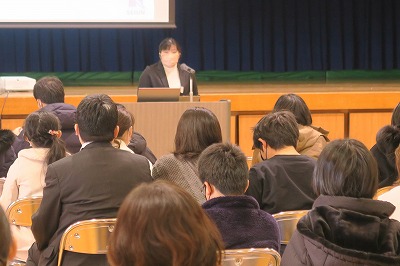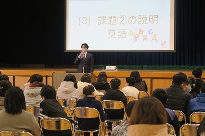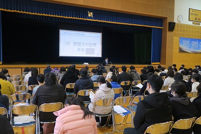 説明会の始めに、池田校長先生の挨拶があり、その後、新田青雲中等教育学校に入学してからの学校生活における様々な情報が分かりやすく説明されました。また、受験を終えてから入学までの間に基本的な学習習慣を身につけてもらうための課題についても、各教科の担当者より解説がありました。閉会後は指定販売もあり、入学までの準備も着実に整えられたようでした。