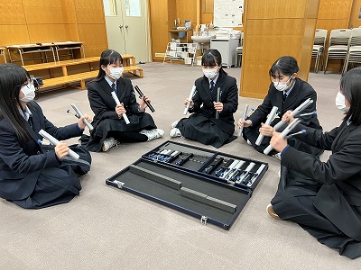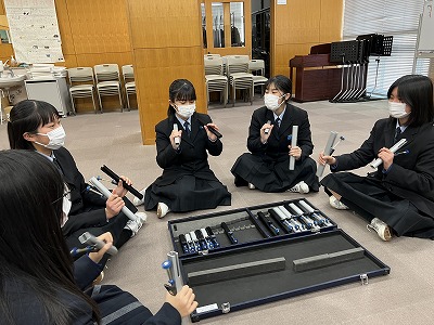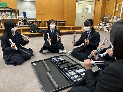 15期生の卒業式が近づいてきました。卒業式の式前と入場・退場時には、毎年音楽部がトーンチャイムを演奏しています。トーンチャイムは、一人2本を持って演奏するので、1曲を演奏するのに人数が必要です。そのため、5年生から臨時で演奏に加わってくれています。今週はテスト期間中ですが、テストが終われば練習再開です。主に昼休みと放課後に練習をしています。卒業生が気持ちよく入場・退場できるように、練習を積み重ねていきます。