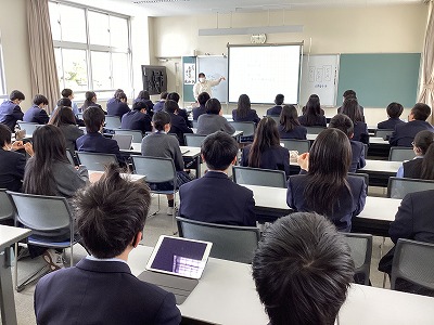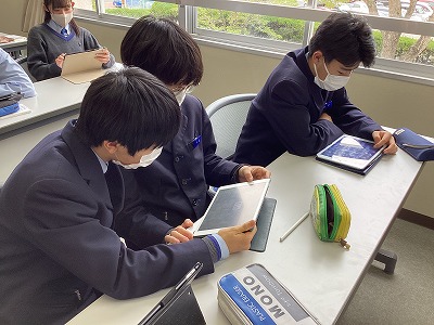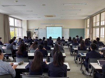3年生になるともう一つ始まるのが、「夢ラボ」研究です。ガイダンスでは、どのような研究をするのか、どのように進めていくのかなどの話があり、生徒たちはさっそく示された研究材料のテーマについてタブレットで調べていました。年度末の発表が今から楽しみです。