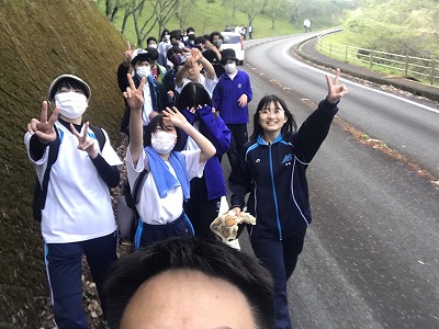 学習合宿2日目は、午前中に進路調べ学習や自学自習に取り組んだ後、これからの後期課程での生活のどんな困難にも負けない忍耐力を養うために、長距離歩行を行いました。