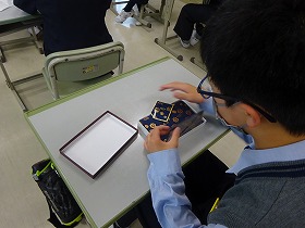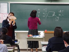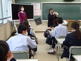 ほとんどの生徒が初めて茶道道具に触れるということで、「色や模様がきれい」「これは何という名前の道具なのか」「これは何に使う道具なのか」など、興味津々。