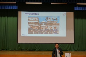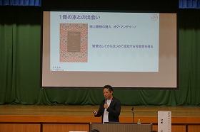 5月27日土曜日1年生と2年生は,株式会社アステティックスジャパンの河野公宏先生からご講演いただきました。演題は「夢大志高~次代を創る先駆者となれ~」というテーマでした。河野先生のお話は実体験にもとづいたお話ばかりで,「中学生の間は熱中することを持つこと」,「夢を口に出して言い続けること」,「人との出会いを大切にすること」,「とりあえずやってみること」などの大切さがよく分かりました。特に強く推薦されていた本オグ・マンディーノの「地上最強の商人」は,調べてみると松山市の中央図書館にも置いているようなので,是非一度読んでみたいですね。