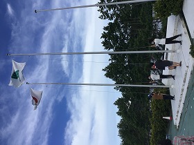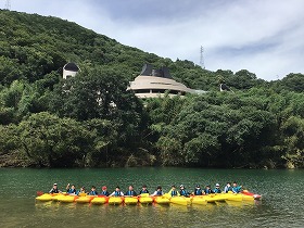 スポーツクライミングでは、施設の職員の方にサポートしていただき、多くの生徒が高い最終地点まで登ることができました。自分の殻を破って挑戦して達成できたため、生徒の表情は輝いていました。カヌー体験では、職員の方の熱心なご指導の下、息を合わせて気持ちよさそうに自然と一体になっていました。みんなで横一列になって、記念写真も撮れました。