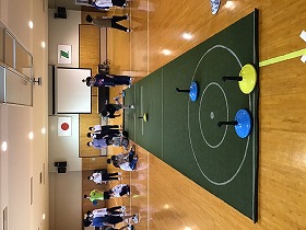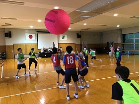武道場では、ユニカールやキンボールで大盛り上がり。初めて体験するゲームなので、興味津々でプレーを楽しみました。
