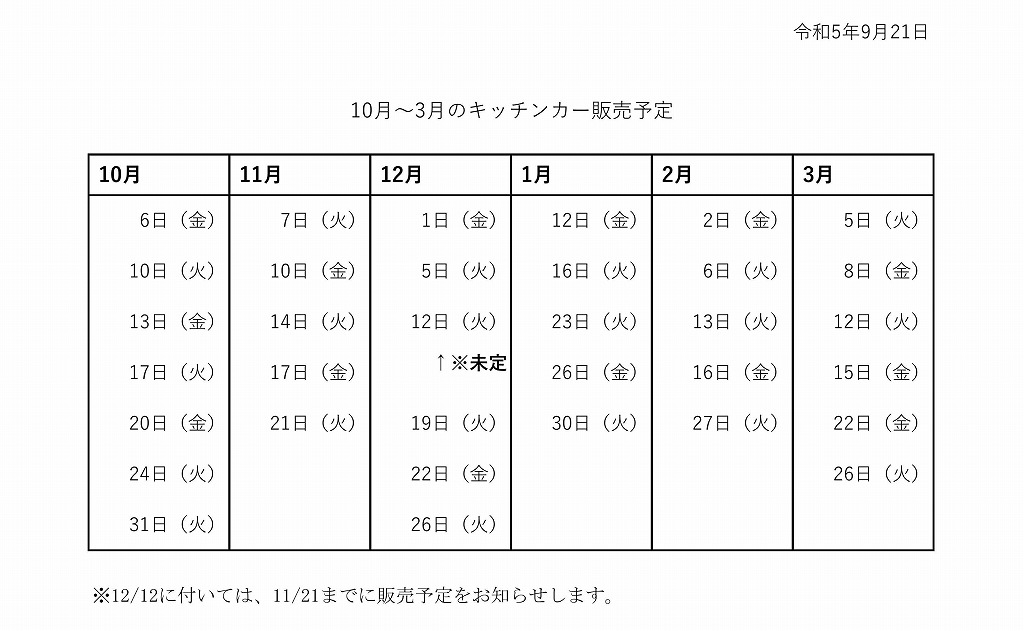 10月~3月のキッチンカー販売予定