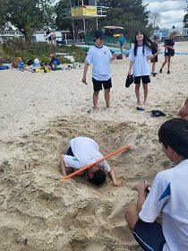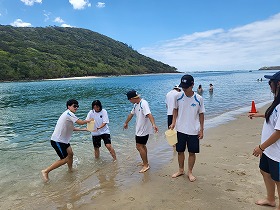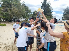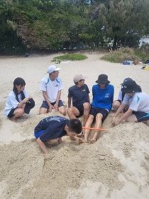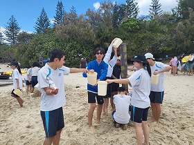 ビーチフラグや穴掘りゲーム、水をためてボールを取るゲームなどグループに分かれて協力しながらアクティビティを行いました。