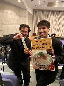 発表の後に行われた「お楽しみ抽選会」では、制服姿で出場した卒業生2人がくじ引きに登壇し、「塩麹漬けおさかな三種セット」をゲット。そして、最後にいつもの場所で記念撮影。この後音楽部伝統のお楽しみ場所に立ち寄り楽しい行事を締めくくりました。