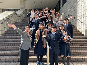 発表の後に行われた「お楽しみ抽選会」では、制服姿で出場した卒業生2人がくじ引きに登壇し、「塩麹漬けおさかな三種セット」をゲット。そして、最後にいつもの場所で記念撮影。この後音楽部伝統のお楽しみ場所に立ち寄り楽しい行事を締めくくりました。
