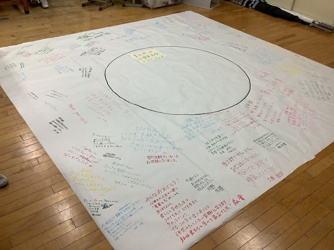毎年、生徒会が大きな台紙を用意して在校生や先生方が思い思いの言葉を書き込んでいきます。
