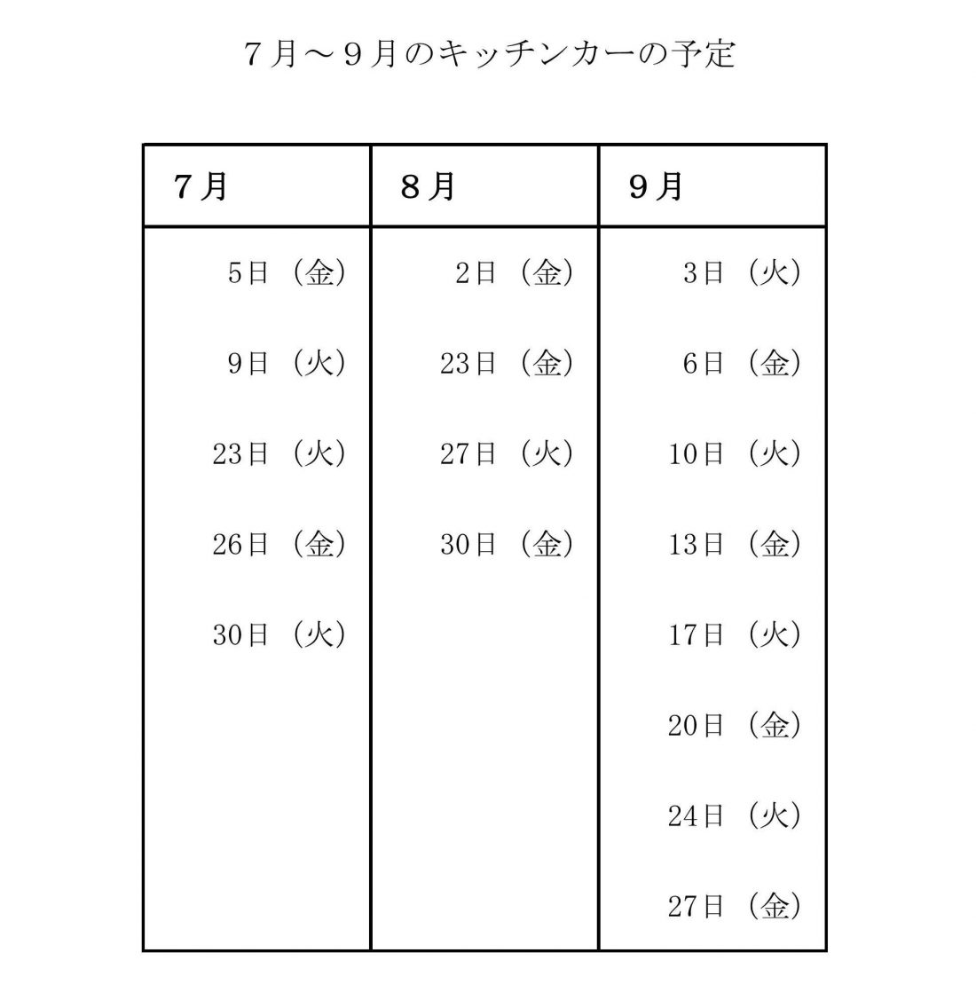 7月 キッチンカー販売予定