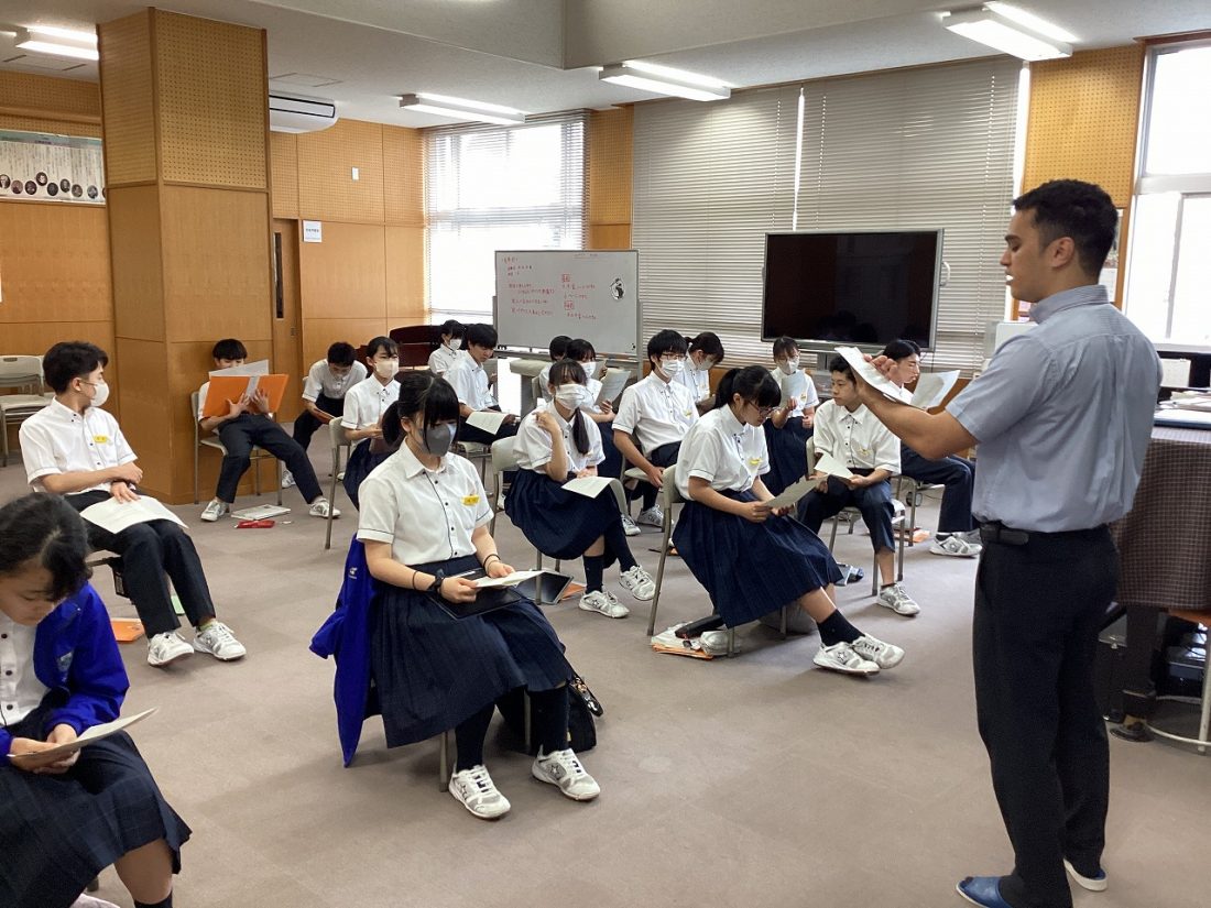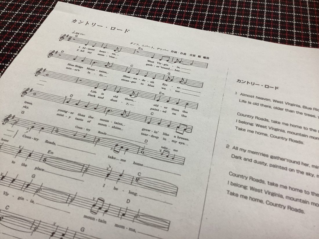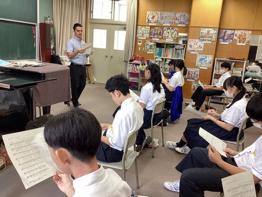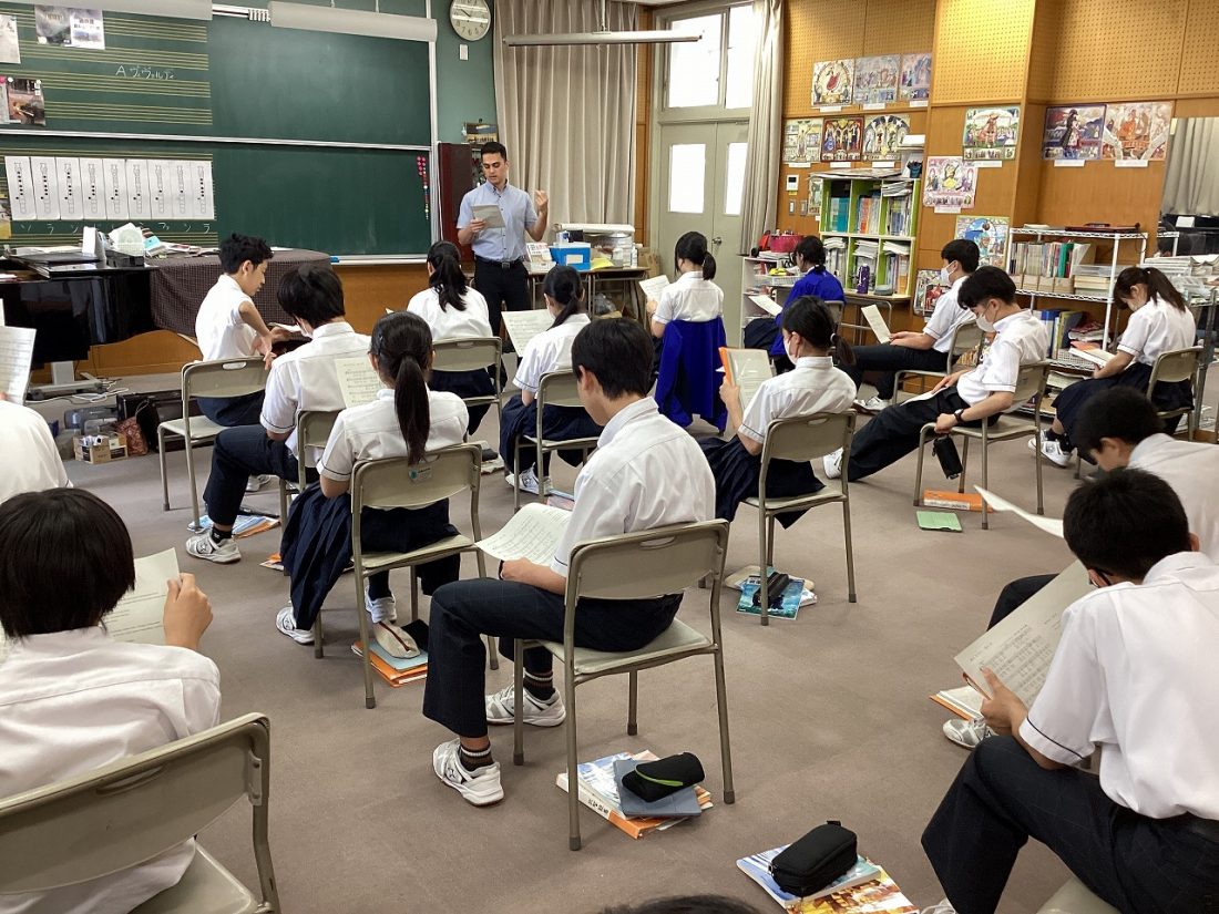 音楽の授業では、イマージョン学習の一環で英語の歌を歌ったり、英語で音楽記号のビンゴゲームをしたりしていますが、今回2年生では有名な「カントリー・ロード」をブランドン先生に教えていただきながら歌いました。有名な曲だけあって、曲を知らない生徒はいないようでしたが、英語で歌ったことがある生徒は少数でした。