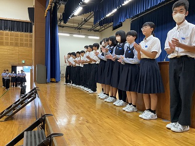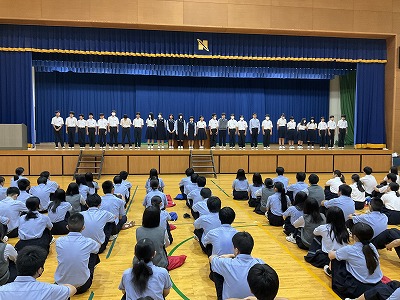 今朝、全校朝礼にて、中学校の新人戦の壮行会が行われました。