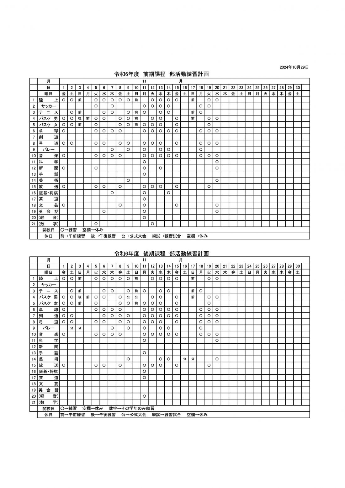 11月の部活動の計画を掲載しました。