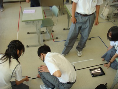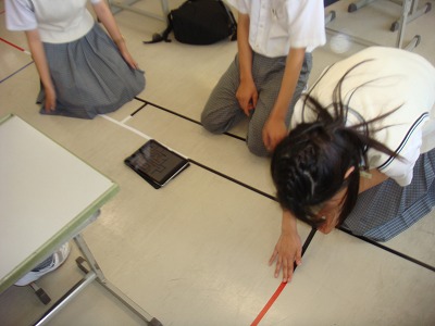 「迷路」を企画しているクラスは、迷路図を教室の床に、テープで引いています。