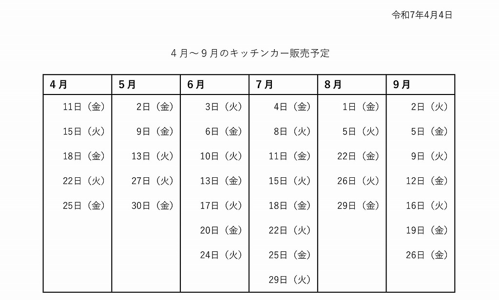 4月~9月のキッチンカー販売予定を掲載しました。