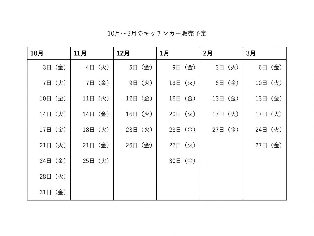 10月~3月のキッチンカー販売予定を掲載しました。