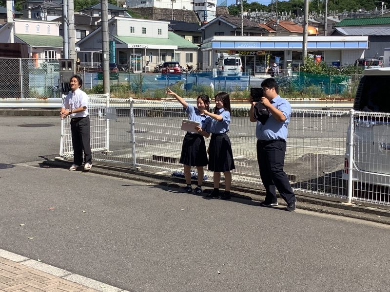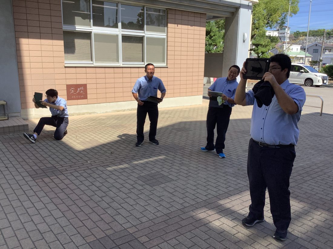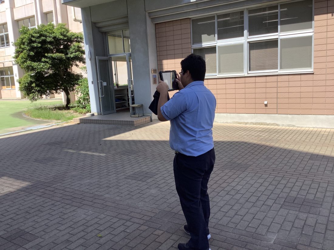 雲一つない青空の下、校舎を撮影したり、創意工夫しながら動画を取ったりして、よい作品を編集するための準備をしました。