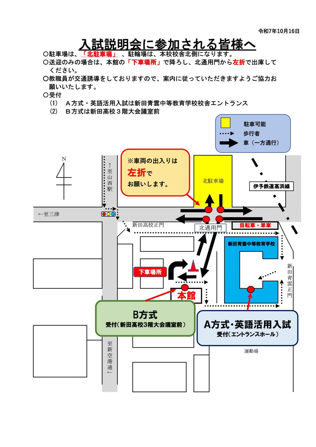 受付はお申込みいただいた方式別(A方式と英語活用入試は、新田青雲エントランスホール、B方式は新田高校3F大会議室)になっております。