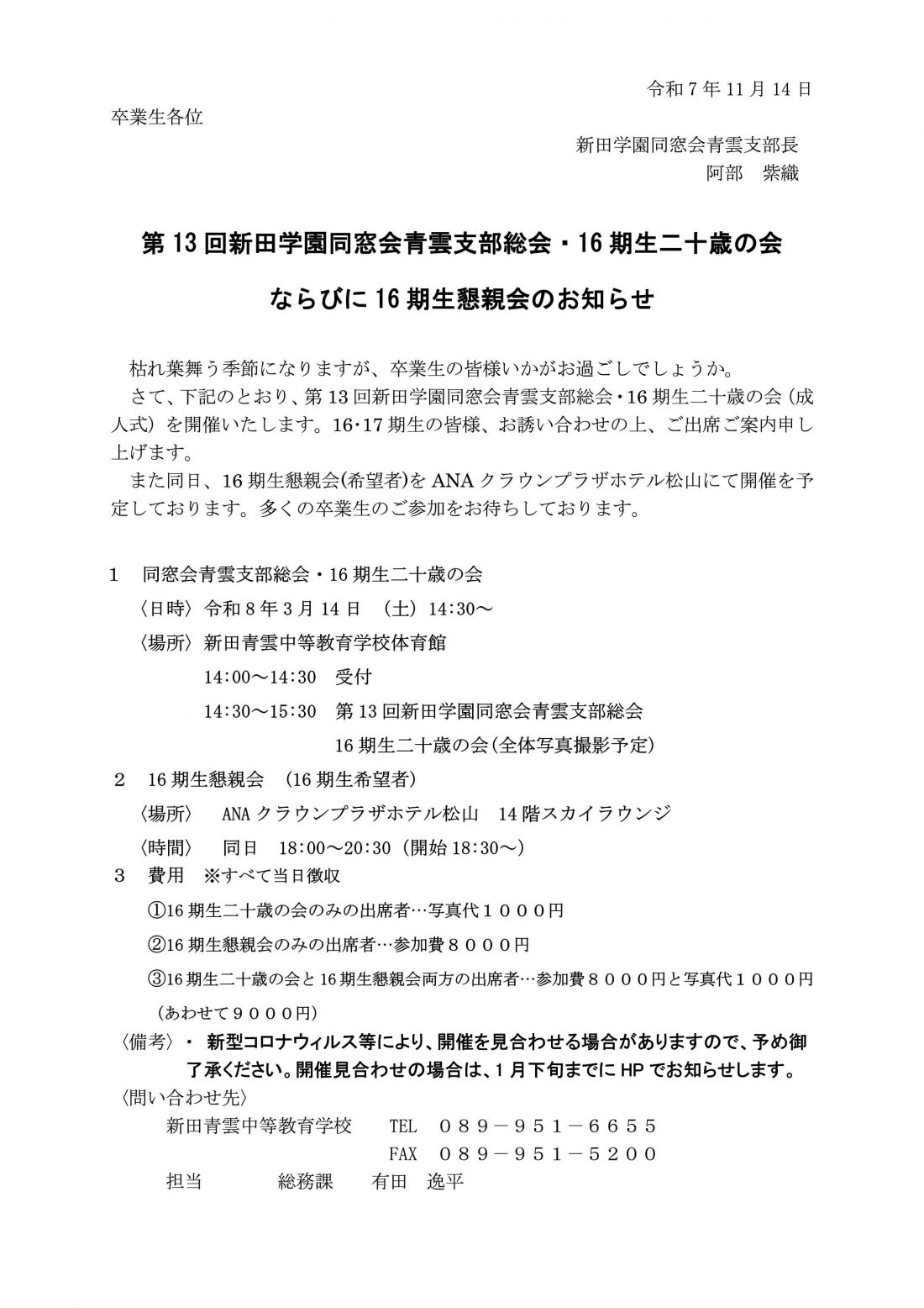 第13回新田学園同窓会青雲支部総会・16期生二十歳の会 ならびに16期生懇親会のお知らせ