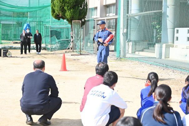 グラウンドでは、消防署の方の助言を受けながら消火器の活用訓練も行いました。