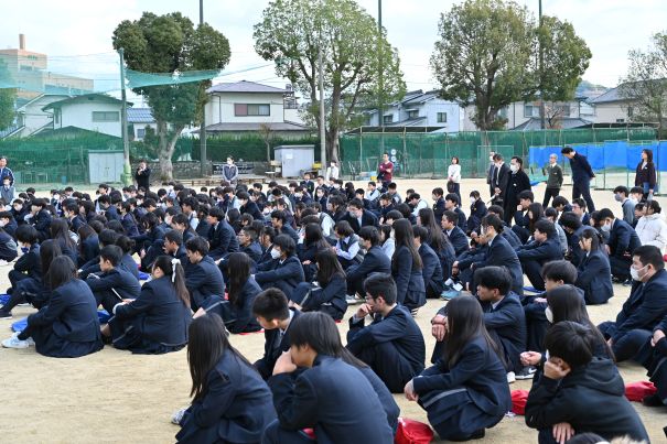 生徒たちは、地震発生の合図とともに、頭部や胸部を守る行動を速やかにとり