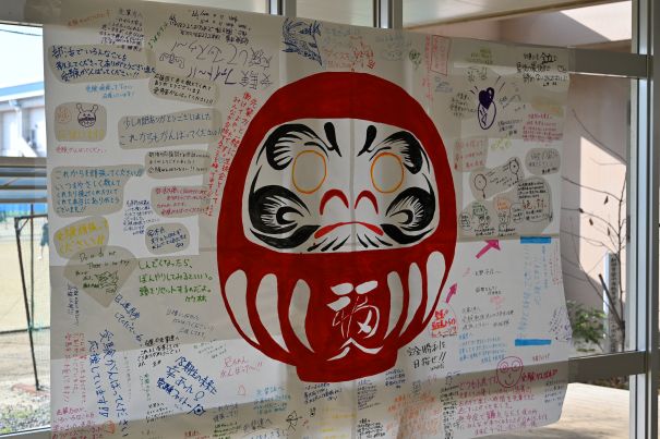 エントランスには、みんなの願いが叶うように大きなだるまの絵と寄せ書きが設けられていました。