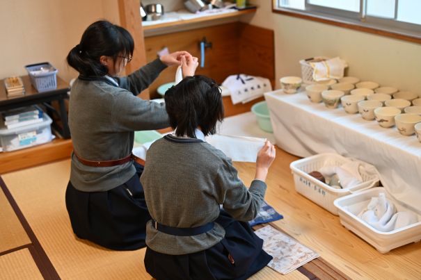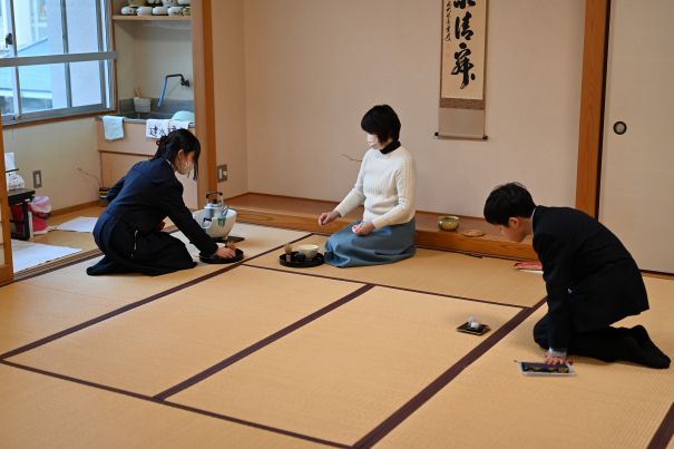 茶道部は、先輩がお点前の作法を丁寧に新入部員に伝授していました。