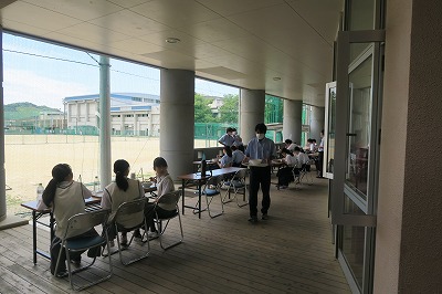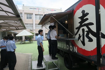 8月4日のお昼休み、夏期特別講座前半では最後のキッチンカーによる昼食販売がありました。この日も30名以上の生徒や先生方がそれぞれ思い思いに食事を楽しんでいたようです。ライアン先生はお箸の使い方も上手に麺をすすっていましたし、6年生の学年主任は、なんと、うどんとラーメンをダブルで注文されたうえに、量が多いと困っていた女子生徒の分まで少し分けてもらいガッツリ食されていました。私も何度か利用させていただいていますが、冷たいとはいえ、お出汁のしっかりと利いたスープが絶品なのでしょうね。しかし、前期生の中には、この暑い日でありながら熱いスープを希望する者もいて、なかなかの通ぶりを示していました。青雲はメン食いが多いのですね。お店の人によると、メニューの中では「冷やし味噌ラーメン」が一番人気で、女子は「冷やしぶっかけ青雲うどん」の注文が多いそうです。